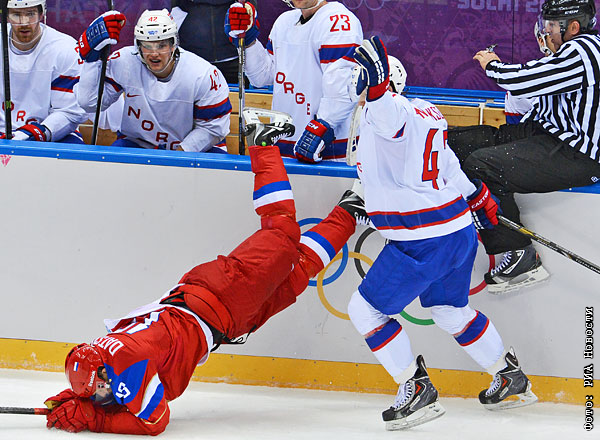 Сборная России обыграла команду Норвегии в 1/8 финала мужского хоккейного турнира на Олимпийских играх-2014 в Сочи. Встреча завершилась со счетом 4:0 (0:0, 2:0, 2:0).
