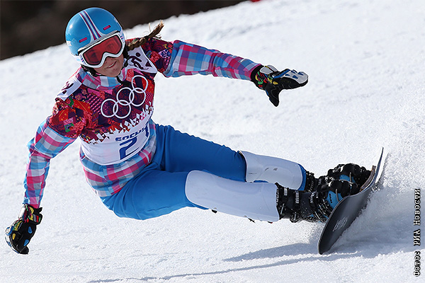 Алена Заварзина в 1/4 финала параллельного гигантского слалома на соревнованиях по сноуборду среди женщин на XXII зимних Олимпийских играх в Сочи.