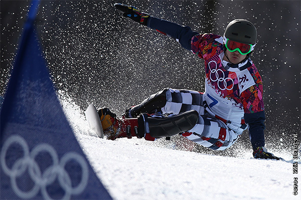 Вик Уайлд в финале параллельного гигантского слалома на соревнованиях по сноуборду среди мужчин на XXII зимних Олимпийских играх в Сочи.