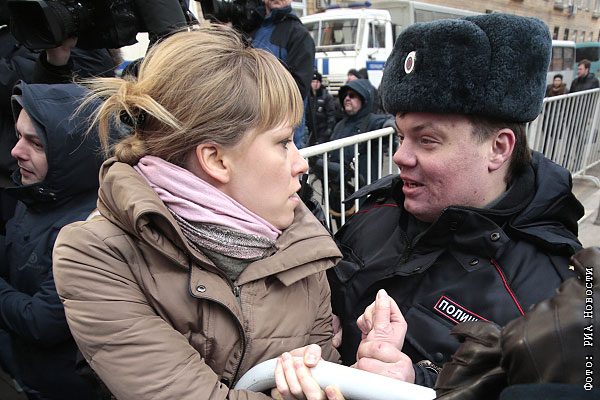 Бывшая обвиняемая по делу о массовых беспорядках на Болотной площади 6 мая Мария Баронова и сотрудник полиции у здания Замоскворецкого суда Москвы.