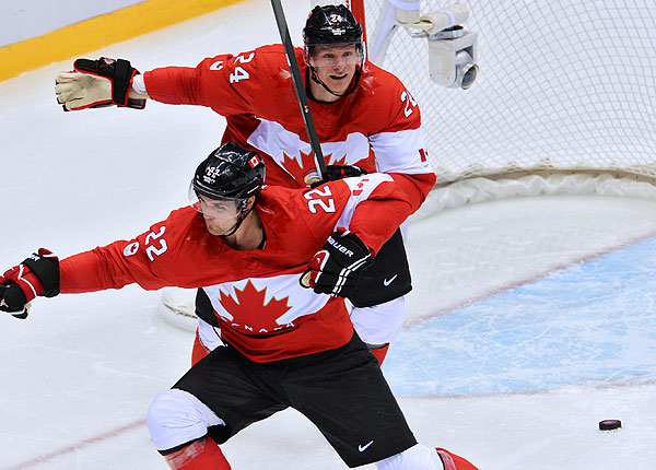 Слева направо: Джейми Бенн и Кори Перри (Канада) радуются забитому голу в полуфинальном матче между сборными командами США и Канады в соревнованиях по хоккею среди мужчин на XXII зимних Олимпийских играх в Сочи.