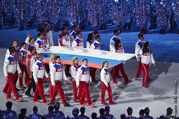 Вынос российского флага во время церемонии закрытия XXII зимних Олимпийских игр в Сочи.