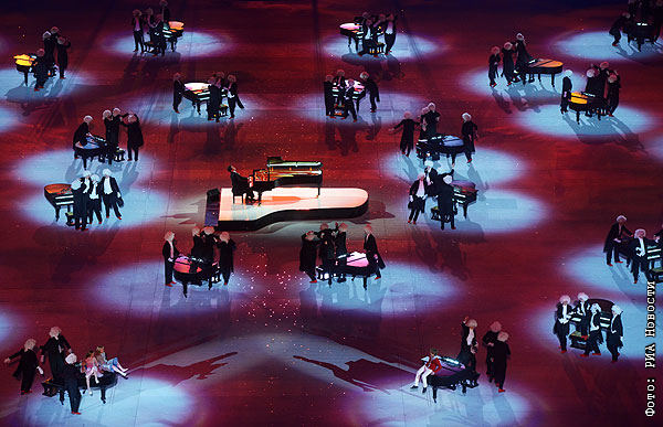 Пианист Денис Мацуев (в центре) выступает на церемонии закрытия XXII зимних Олимпийских игр в Сочи.