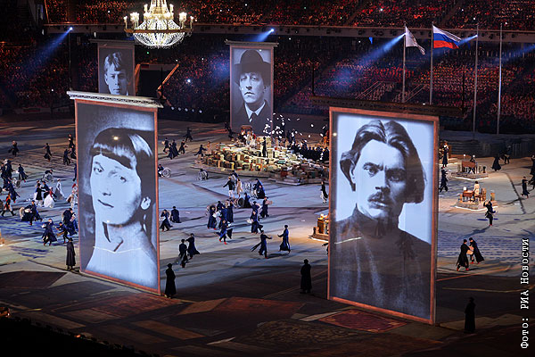 Огромные портреты русских писателей развернули на арене во время церемонии закрытия.