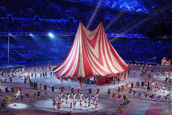 Цирковой шатер во время театрализованного представления на церемонии закрытия XXII зимних Олимпийских игр в Сочи.