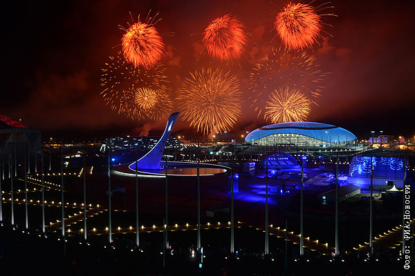 Праздничный фейерверк над Олимпийским Парком во время церемонии закрытия XXII зимних Олимпийских игр в Сочи.