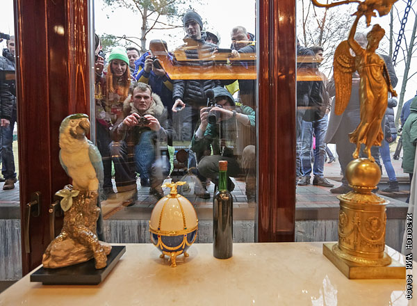 Люди заглядывают в окна резиденции "Межигорье".