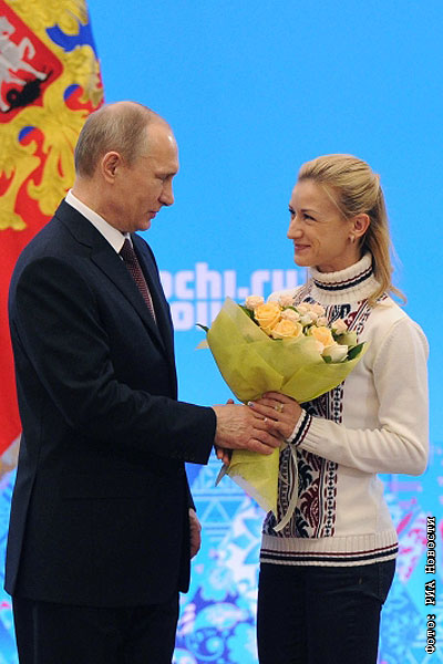Владимир Путин и двукратная олимпийская чемпионка в фигурном катании Татьяна Волосожар во время церемонии награждения российских призеров XXII зимних Олимпийских игр в Сочи.