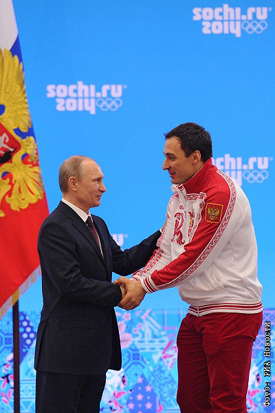 Владимир Путин и двукратный олимпийский чемпион в бобслее Алексей Воевода во время церемонии награждения российских призеров XXII зимних Олимпийских игр в Сочи.