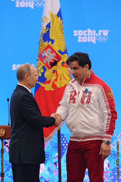 Владимир Путин и двукратный серебряный призер олимпийских игр в санном спорте Альберт Демченко во время церемонии награждения российских призеров XXII зимних Олимпийских игр в Сочи.