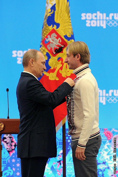 Владимир Путин и олимпийский чемпион в фигурном катании Евгений Плющенко во время церемонии награждения российских призеров XXII зимних Олимпийских игр в Сочи.