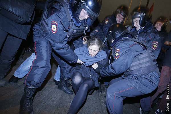 Полицейские задерживают участницу группы Pussy Riot Марию Алехину.