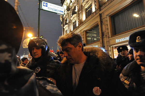 Сотрудники полиции задерживают сопредседателя партии РПР-Парнас Бориса Немцова во время акции протеста сторонников фигурантов "болотного дела" на Манежной площади.