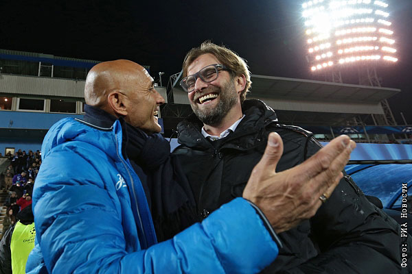 Главный тренер ФК "Зенит" Лучано Спаллетти и главный тренер ФК "Боруссия" (Германия, Дортмунт) Юрген Клопп перед началом матча 1/8 финала Лиги чемпионов УЕФА между ФК "Зенит" (Россия, Санкт-Петербург) и ФК "Боруссия" (Германия, Дортмунд).
