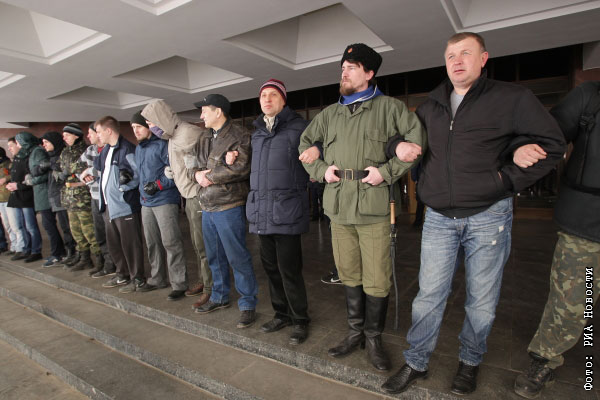 Участники митинга у здания верховного совета Крыма в Симферополе.
