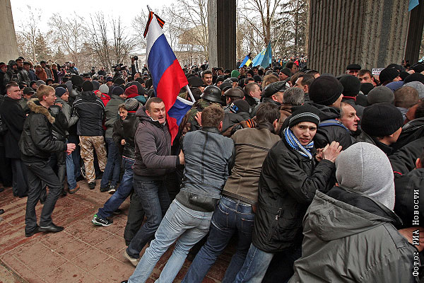 Участники митинга у здания верховного совета Крыма в Симферополе.