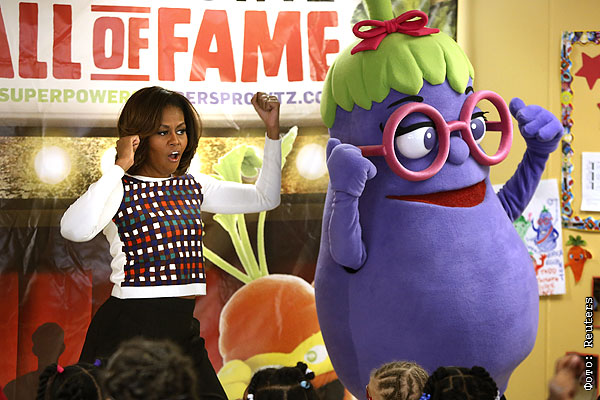 Первая Леди США Мишель Обама танцует с Баклажаном. Мишель Обама известная активистка проекта "Давайте двигаться", призванного агитировать американских детей больше двигаться и есть здоровую пищу.