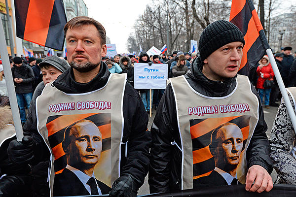 Участники молодежных и ветеранских патриотических организаций во время шествия в Москве в поддержку соотечественников на Украине.