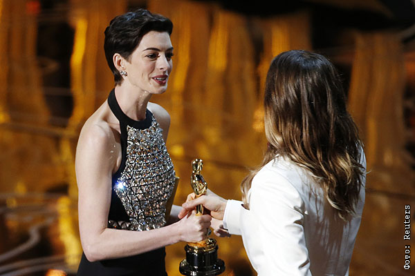 Энн Хэтэуэй вручает награду за лучшую роль второго плана Джареду Лето, сыгравшему в фильме "Далласский клуб покупателей".