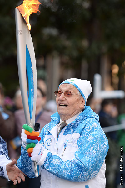 Участник Великой Отечественной войны Павел Сюткин во время эстафеты паралимпийского огня в Сочи.