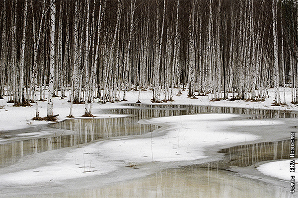 Талая вода в подмосковной березовой роще.