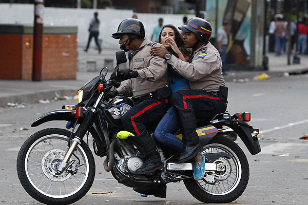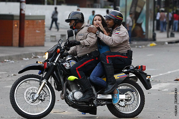 Полицейские задерживают девушку из толпы протестующих в Каракасе.