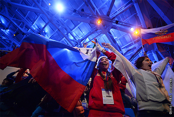 Российские болельщики перед началом церемонии открытия XI зимних Паралимпийских игр в Сочи.