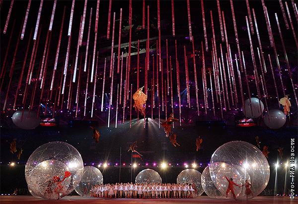 Артисты во время театрализованного представления на церемонии открытия XI зимних Паралимпийских игр в Сочи.