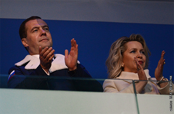 Председатель правительства РФ Дмитрий Медведев с супругой Светланой во время театрализованного представления на церемонии открытия XI зимних Паралимпийских игр в Сочи.