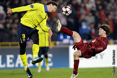 Игроки "Рубина" Кристиан Ансальди и "Барселоны" Златан Ибрагимович в матче Лиги чемпионов по футболу: "Рубин" (Казань) – "Барселона" (Барселона) - 0:0