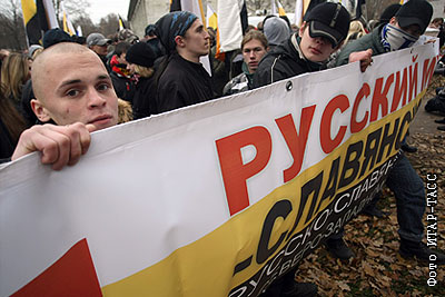 Участники акции "Русский марш" в парке 50-летия Октября, организованной в День народного единства Славянским союзом и Движением против нелегальной иммиграции