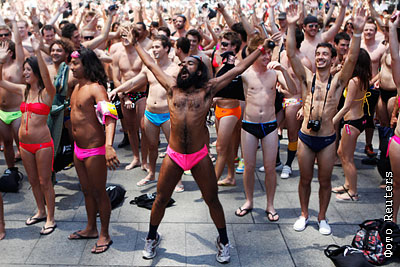 Участники парада в Сиднее пытаются побить мировой рекорд, зарегестрированный в книге рекордов Гиннесса, как самый многочисленный парад купальных костюмов