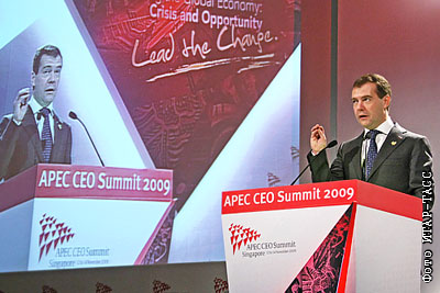 Президент России Дмитрий Медведев во время выступления на деловом саммите АТЭС