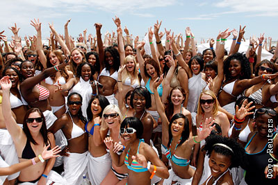 Часть представительниц прекрасного пола, собравшихся в Кейптауне, с целью установить новый мировой рекорд наибольшего количества девушек в купальных костюмах, поместившихся в один фотокадр