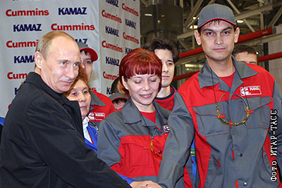 Премьер-министр РФ Владимир Путин (слева) на открытии производства дизельных двигателей на совместном российско-американском предприятии "Камминз КАМА" в Набережных Челнах