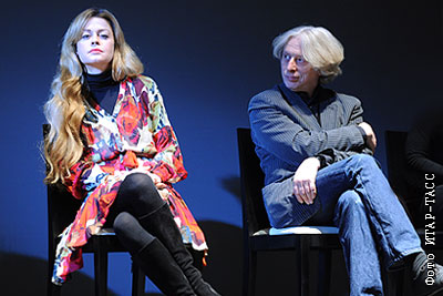 Оперная певица Елена Жидкова, исполняющая партию Мари, и музыкальный руководителем Государственного академического Большого театра (ГАБТ), композитор Леонид Десятников на презентации оперы "Воццек" в постановке Д.Чернякова и Т.Курентзиса в Большом театре