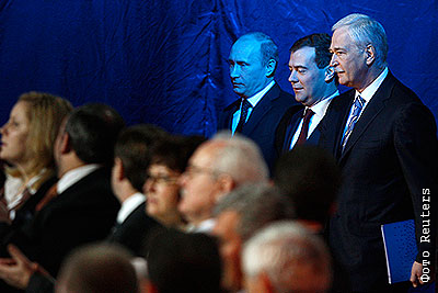 Премьер-министр России, председатель партии "Единая Россия" Владимир Путин, президент России Дмитрий Медведев и спикер Госдумы РФ, председатель Высшего совета партии "Единая Россия" Борис Грызлов на 11-м Съезде партии "Единая Россия"