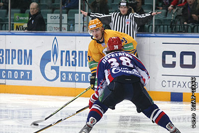 Игроки "Атланта" Николай Жердев (на втором плане) и "СКА" Сергей Перетягин (на первом плане) в матче чемпионата КХЛ: "СКА" (Санкт-Петербург) – "Атлант" (Московская область)