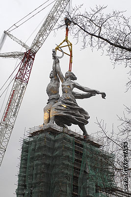 Установка скульптурной группы Веры Мухиной "Рабочий и колхозница" на постамент на территории ВВЦ