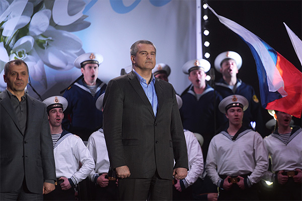 Председатель Верховного Совета Автономной Республики Крым Владимир Константинов и премьер-министр Автономной Республики Крым Сергей Аксенов (слева направо на первом плане) на праздничном концерте "Крым-Весна" на площади Ленина в центре Симферополя в день голосования на референдуме о статусе Крыма.