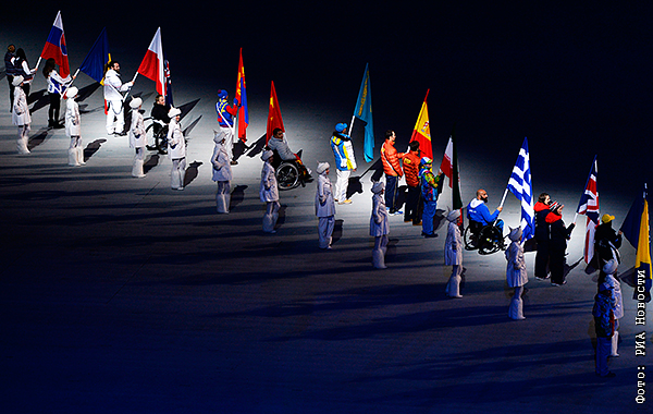 Парад знамен на церемонии закрытия XI зимних Паралимпийских игр в Сочи.