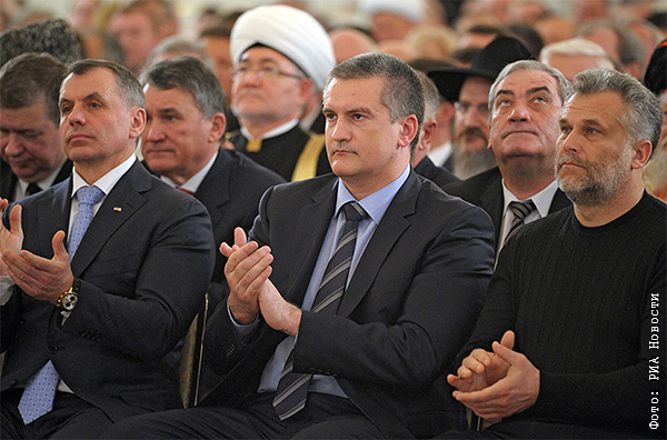 Спикер парламента Крыма Владимир Константинов, глава правительства Крым Сергей Аксенов и глава Севастополя Алексей Чалый (слева направо на первом плане) во время выступления президента России Владимира Путина.