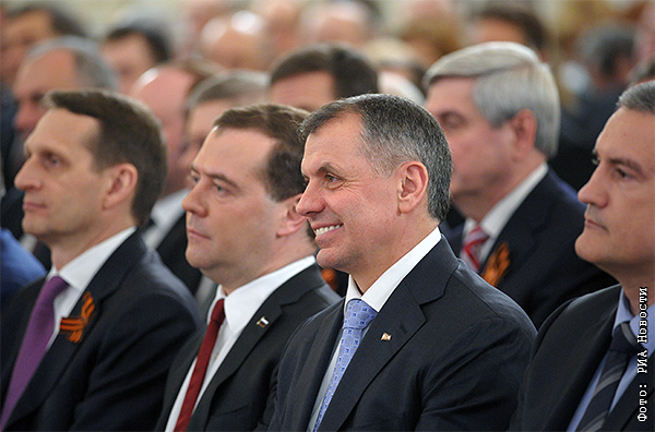 Председатель Госдумы Сергей Нарышкин, премьер-министр Дмитрий Медведев, председатель парламента Крыма Владимир Константинов и глава правительства Крыма Сергей Аксенов (слева направо) во время выступления президента России Владимира Путина.