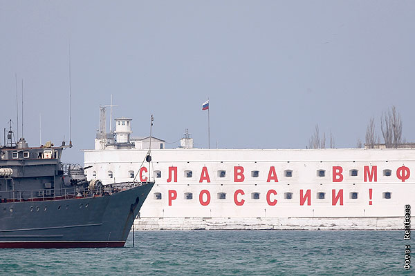 Российский военный корабль в порту Севастополя.