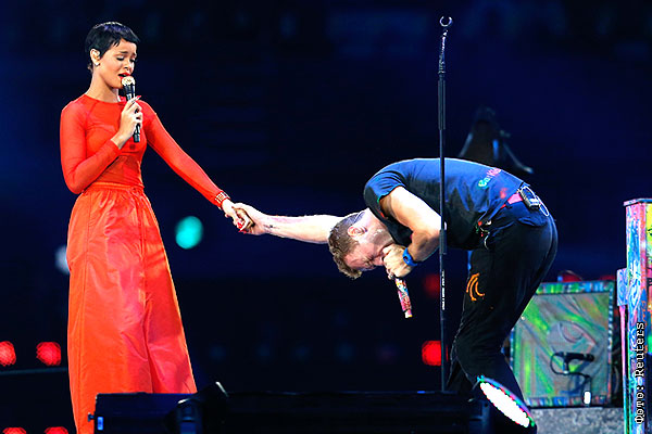 Рианна и Крис Мартин во время выступления на церемонии закрытия Паралимпийских игр в Лондоне.