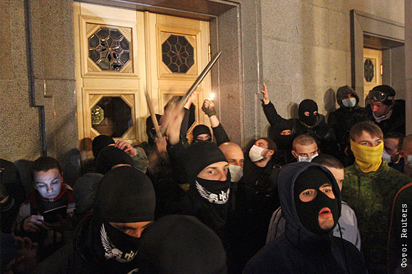 Активисты "Правого сектора" в балаклавах и с дубинками перед зданием Верховной рады в Киеве.