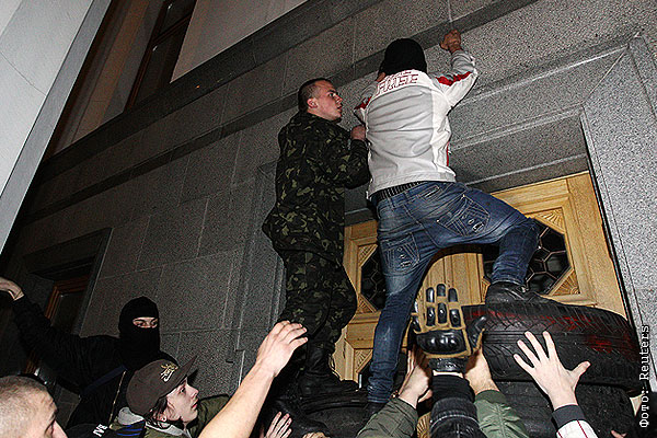 Активисты "Правого сектора" пытаются забраться на стену здания Верховной рады в Киеве.