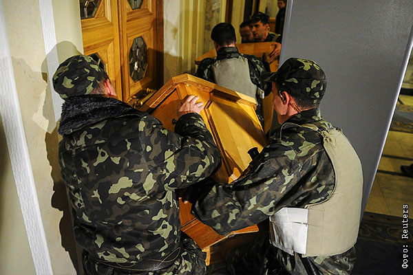 Сотрудники охраны здания Верховной рады в Киеве блокируют двери деревянными тумбами.