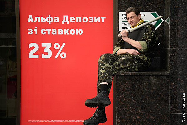Участник "самообороны Майдана" сидит перед киевским офисом Альфа-банка.