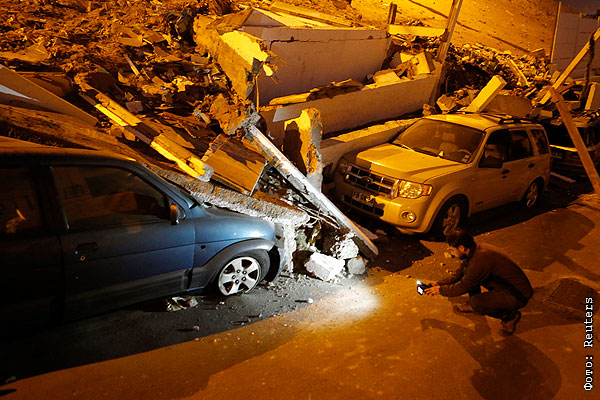 Мужчина фиксирует на камеру последствия землетрясения в чилийском городе Икике.
